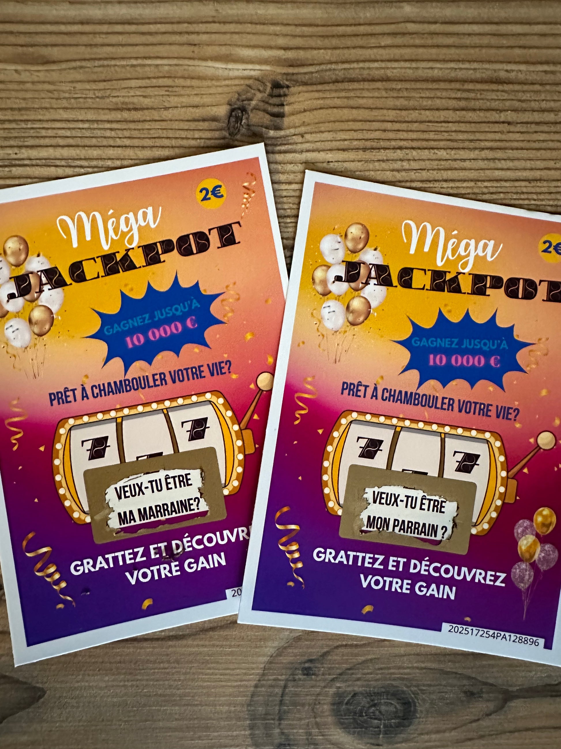 Tickets « Mega Jackpot » à gratter, pour annoncer votre grossesse aux proches, ou même demander d’être marraine/ parrain aux heureux élus.
